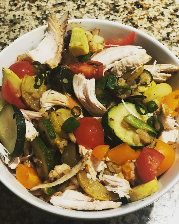 I will season the chicken with salt, lemon pepper seasoning, garlic powder, and parsley, I use olive oil on the bottom of the skillet and turn the oven to a high heat. I will brown all sides of the chicken usually a little over a minute on each side, I am not cooking the chicken just getting it browned and getting the seasoning into the chicken. While I am cooking the chicken I cut up the vegetables, I use summer squash, zucchini, red onions, and tomatoes. As the chicken cooks I add all the vegetables into the pan and start to cook everything down. I will season all the vegetables with the same mix that I used for the chicken, I usually have the chicken in the middle of the pan and the vegetables all around it, as everything cooks down I add a 1/2 cup of water into the pan and then place it into the oven. I will leave the cast iron skillet in the oven for around twenty minutes or so at 415 degrees. This time is likely to vary depending on the size of chicken breast you are using and your oven, when the chicken is cooked take it out of the oven 20 minutes is usually what it takes for me. The rice should be done by this time so now there is one last thing to do. I will remove the chicken and veggies from the skillet and spread the rice over the bottom of the skillet, I will then take all the vegetables and the now shredded chicken and place it over the rice, then place everything back into the oven for another 7 minutes or so. A crust should form with the rice on the bottom of the skillet to add that added crunch that just makes everything a little better to eat. I garnished this with some green onions and this was a healthy and hearty dinner to go